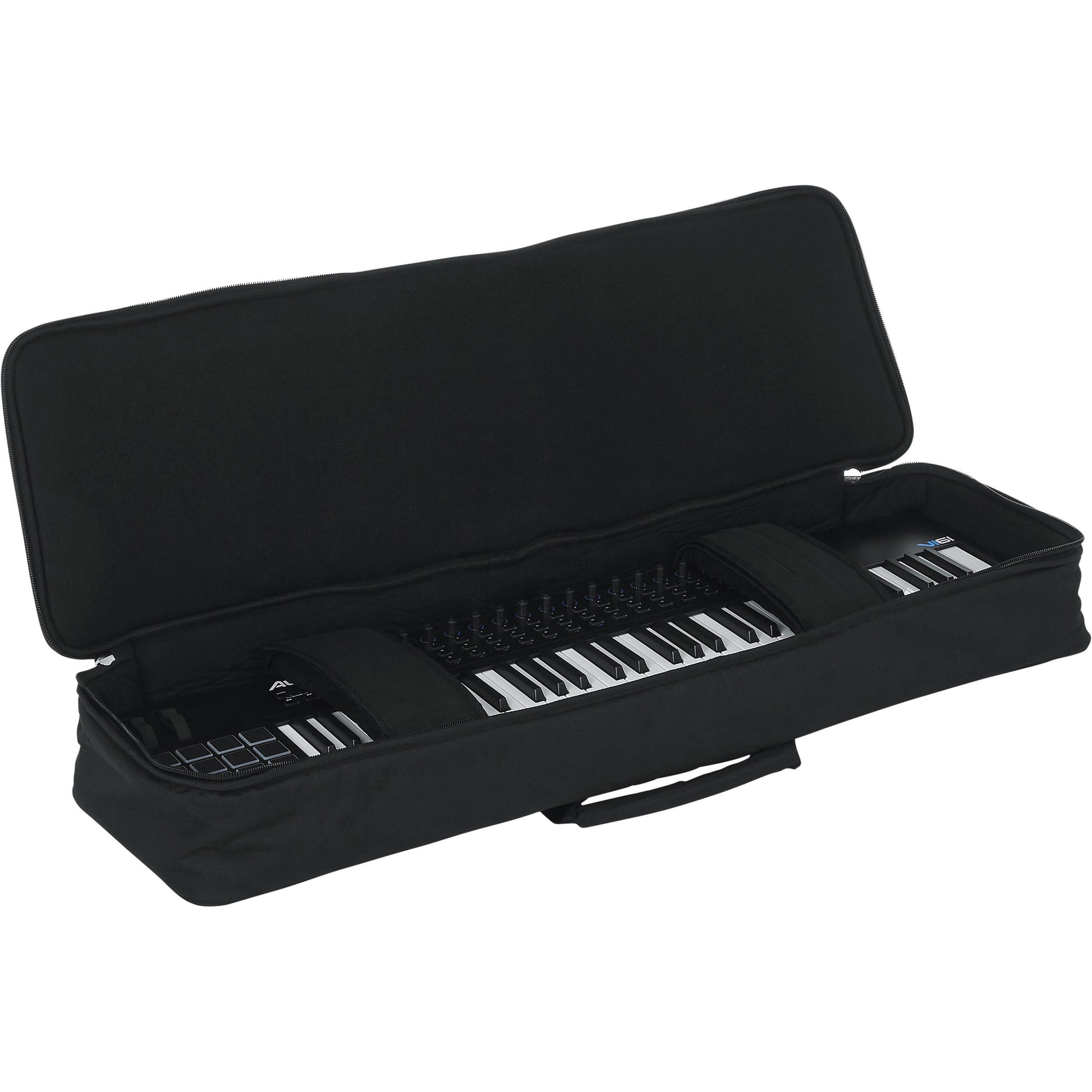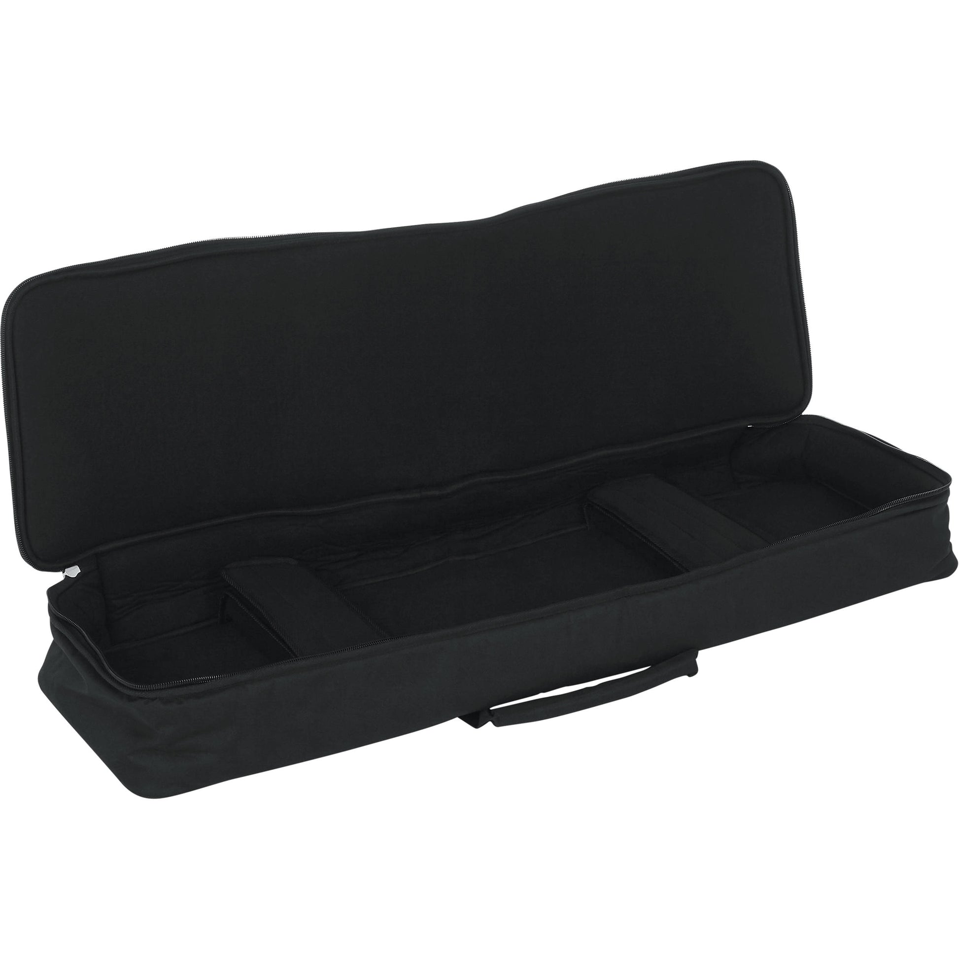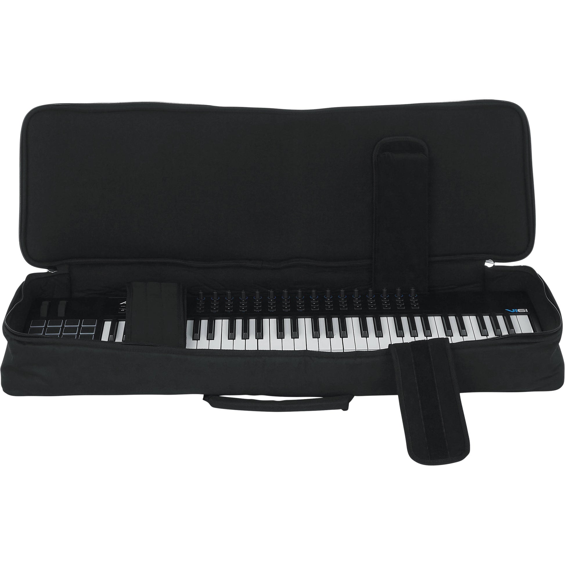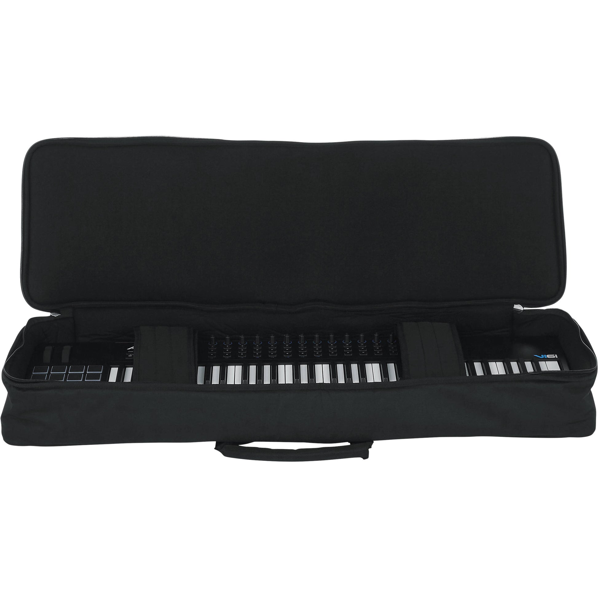The black Keyboard Gig Bag from Gator Cases fits most 61-Note Slim Keyboards.