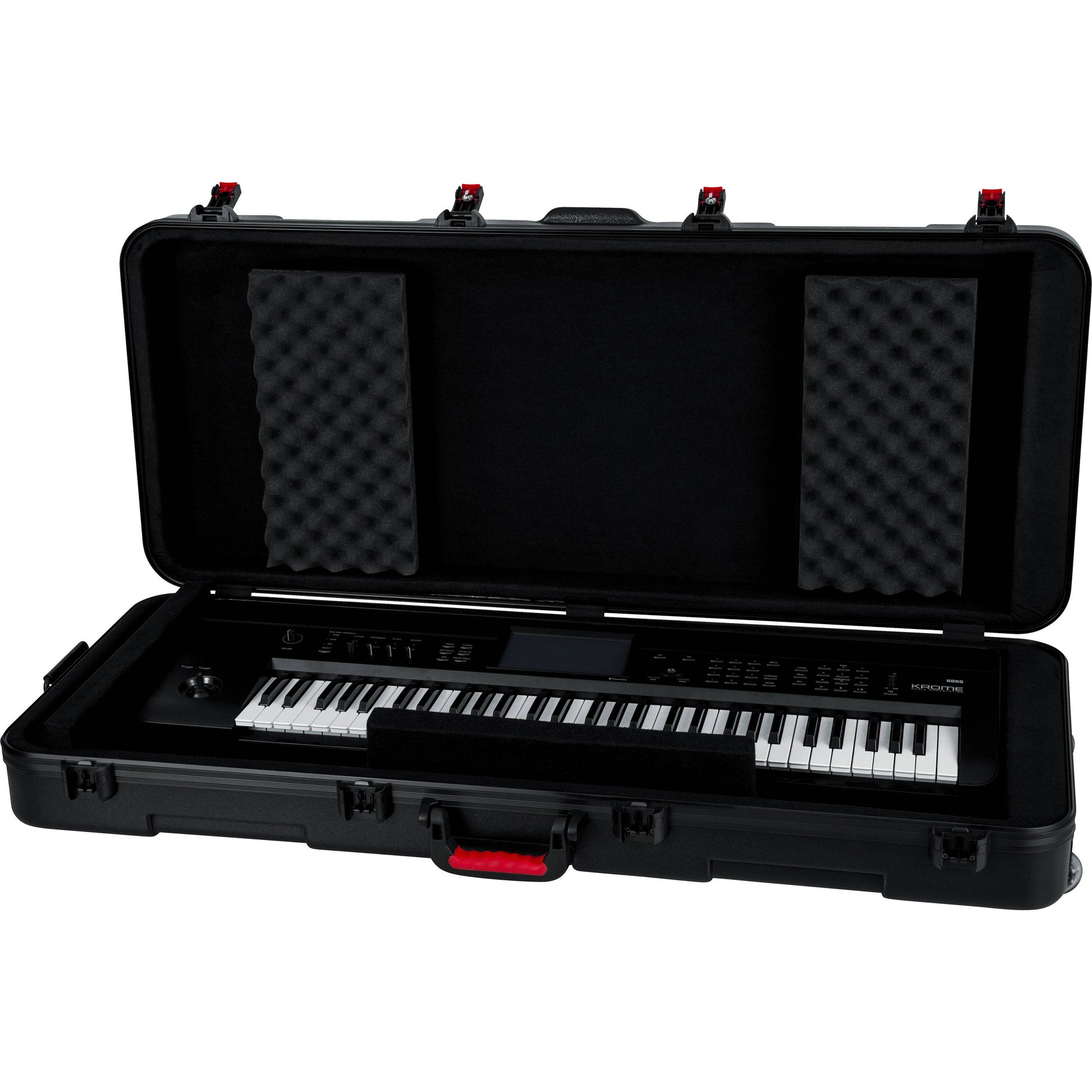 The interior of the case has a customizable wedge & block system which securely holds the keyboard in place during transit. The adjustable wedges also allow excess space to be used for storing your cables, foot switch, and other accessories. Heavy-duty and durable, this case is built out of nearly-indestructible polyethylene plastic with black powder-coated hardware and a continuous valance that gives extra rigidity by spreading the support evenly around the perimeter of the case. Recessed in-line wheels, an ergonomic rubber-gripped top handle, and an additional spring-loaded rubber grip side handle provide convenient carry and tow options.