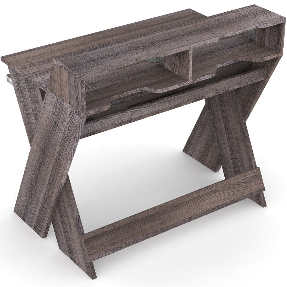 The Glorious Sound Desk Compact is a streamlined studio workstation designed for modern producers and musicians. Despite its small footprint, it offers ample space for a full production setup, including monitors, screens, rack gear, controllers, synths, and even a master keyboard. With smart cable management, sturdy construction, and adjustable ergonomics, it brings professional workflow into compact studio spaces.