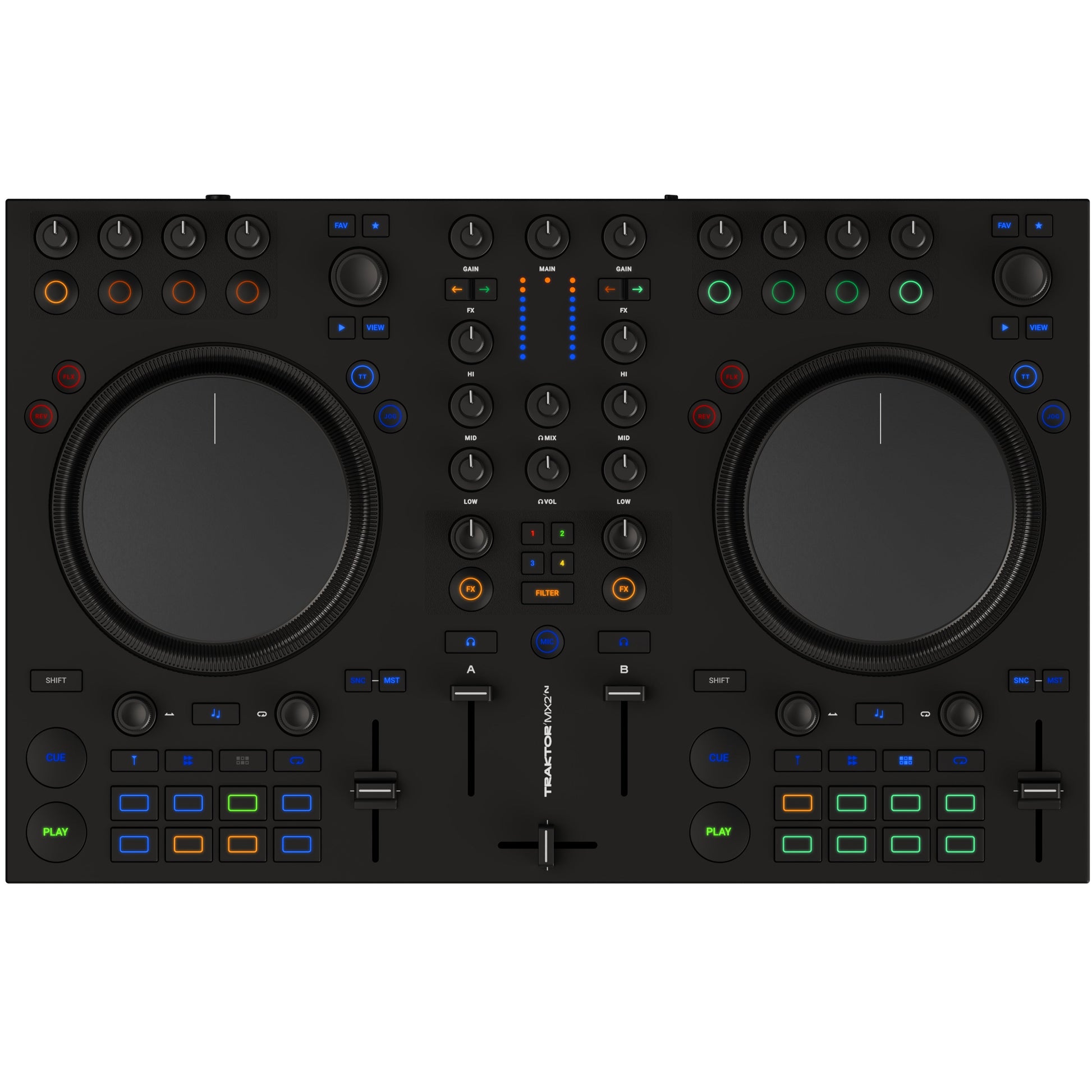 The Native Instruments Traktor MX2 is a next-generation 2-channel DJ controller designed to give emerging and professional DJs intuitive, hands-on control over their performances. Combining high-quality build, a built-in 24-bit / 96 kHz audio interface, and the full version of Traktor Pro 4 software, the MX2 delivers a complete creative DJ solution for home, studio, or club use. Its versatile design includes touch-sensitive jog wheels, RGB performance pads, and pro-level FX controls that bring the power of Traktor Pro 4 right to your fingertips.