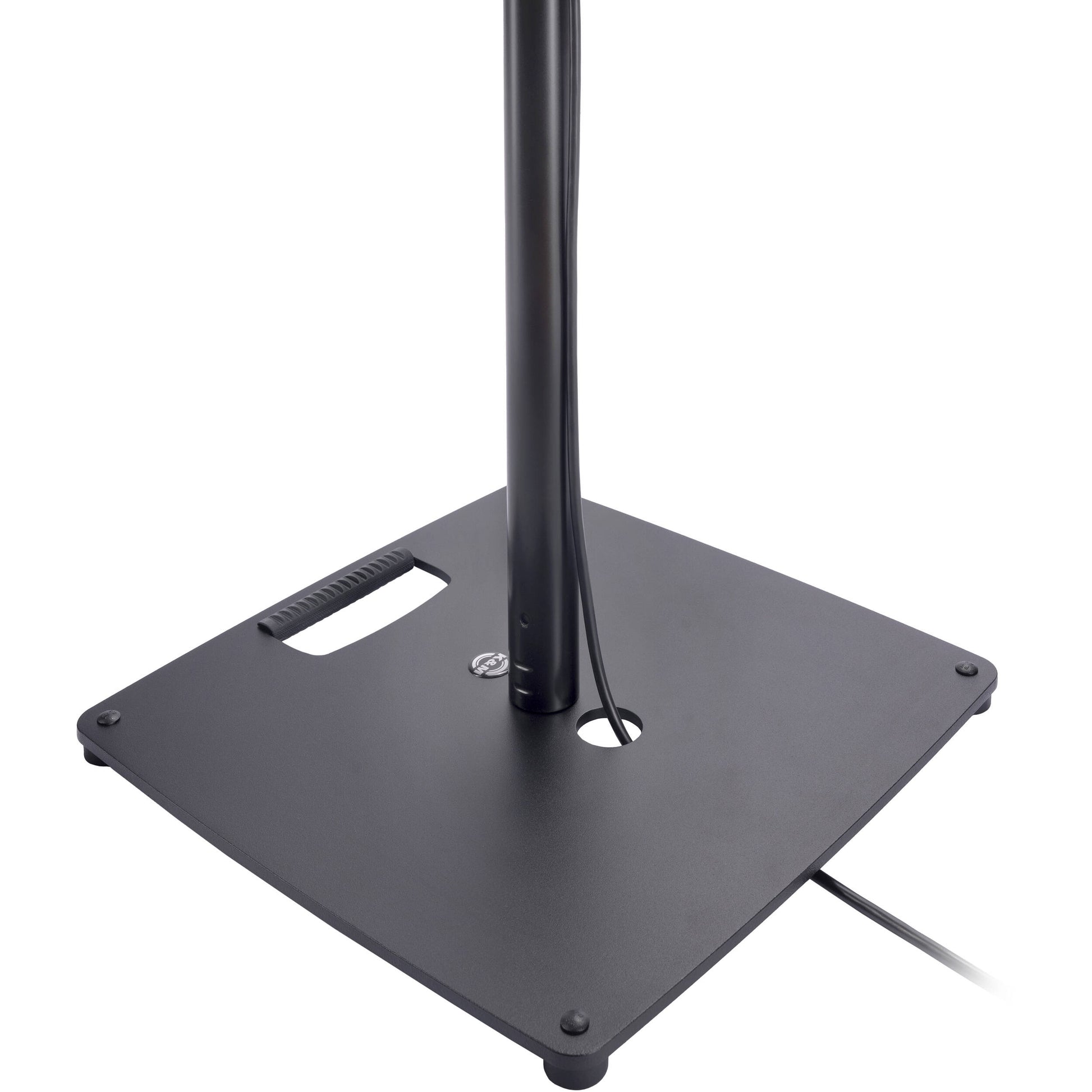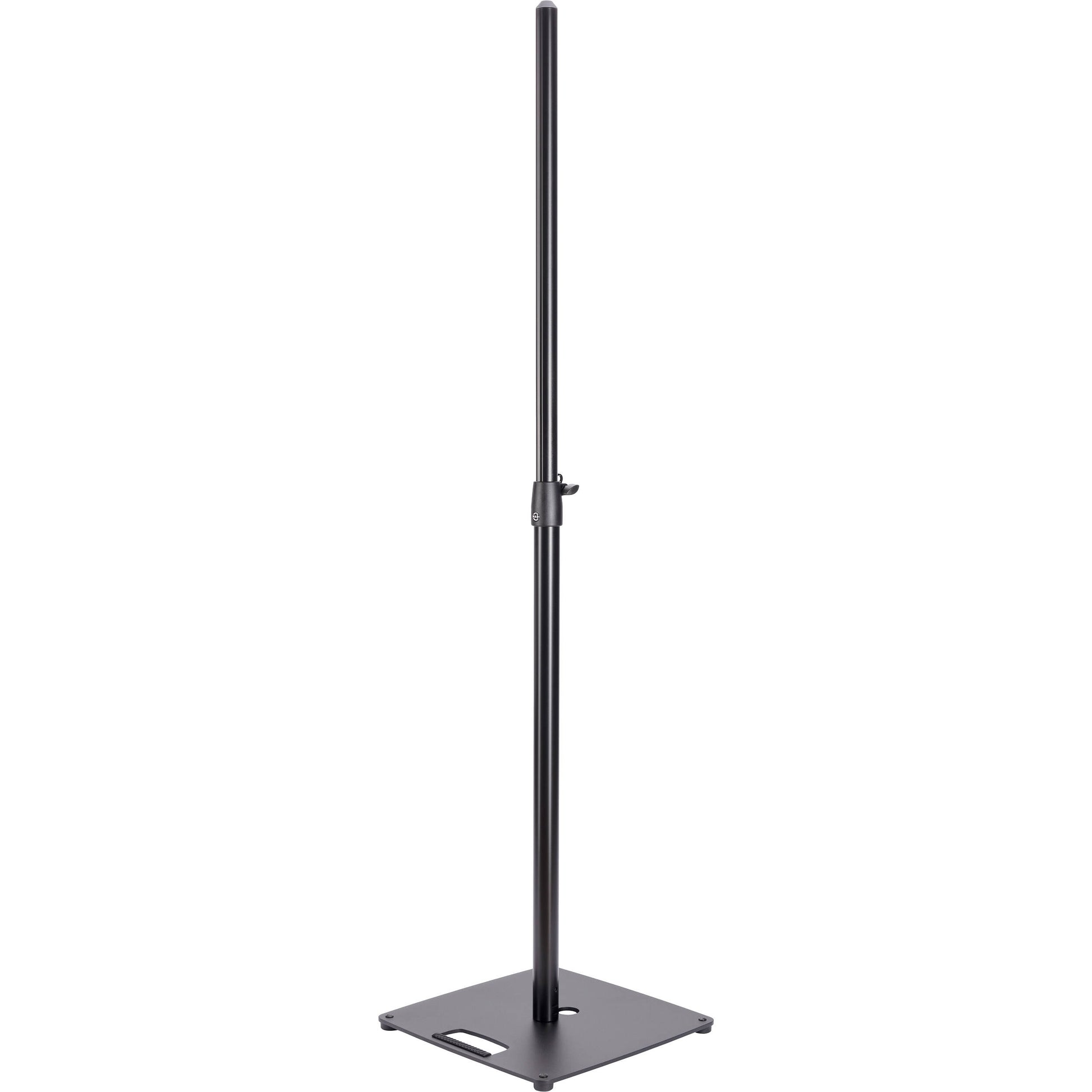 Attraktivt højttalerstativ med flad stålplade (40,6 x 40,6 cm), praktisk bærehåndtag og kabelhåndtering. Stativet er ideelt til brug, hvor pladsen er trang. Højden er fastgjort med en sikkerhedskrog og sikret med en støjsvag og slørfri klemskrue. Klemmens slanke design muliggør pladsbesparende transport og sikrer et stilfuldt udseende. Den brugbare højde er mellem 111 og 181 cm og kan nås i 4 trin på 17,5 cm. Den maksimale lasteevne, når den er fuldt udtrukket, er 18 kg.