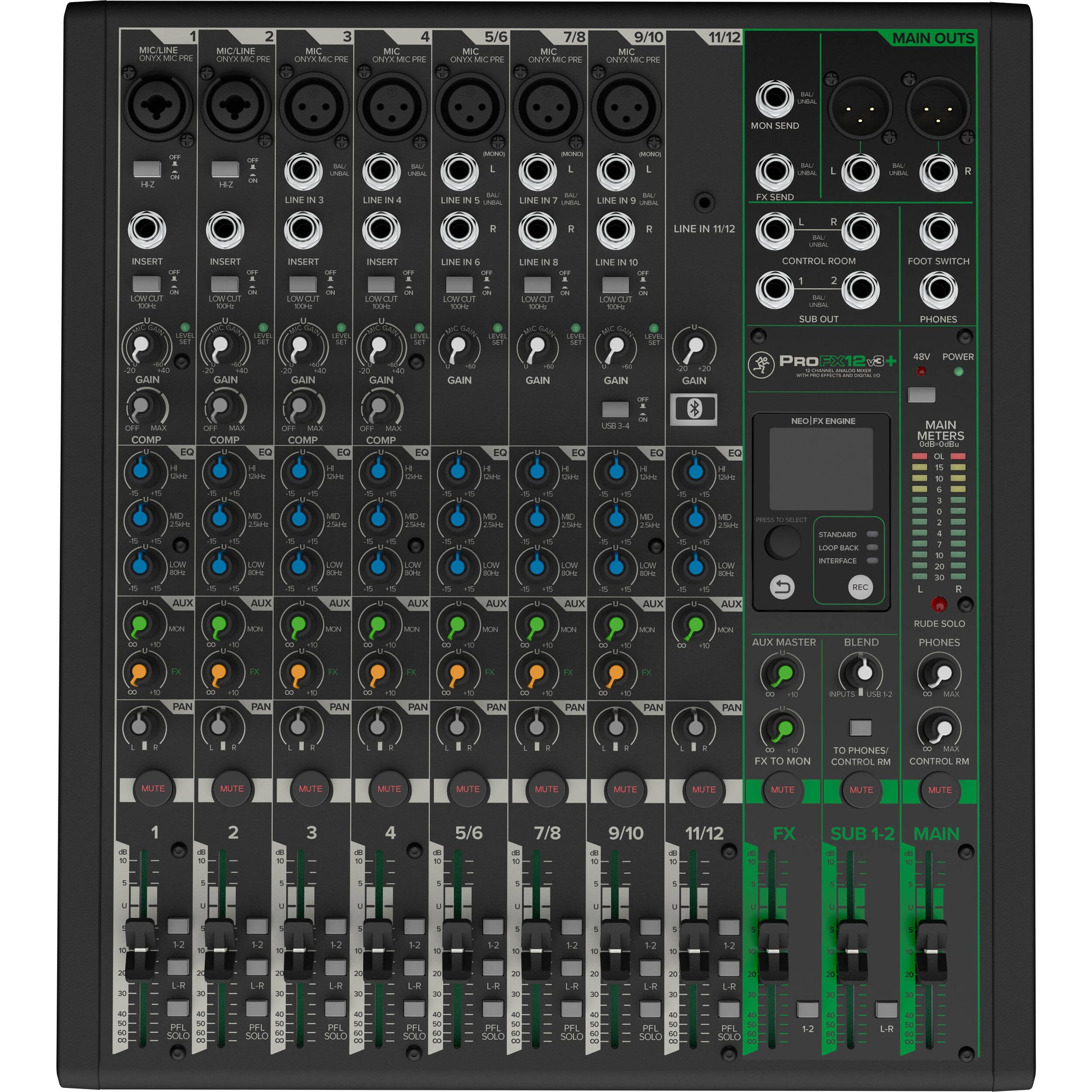 Alle kanaler har 3-bånds EQ, en niveaukontrolknap, en pan-knap, en monitor send-knap og en FX send-knap. Kanal 1-9 har Onyx-mikrofonforforstærkere med 60 dB headroom, kanalindsatser og et low-cut-filter, mens kanaler 1-4 har 1-knaps kompression, og kanaler 1-2 understøtter Hi-Z-indgange til instrumenter. De tre optagetilstande (Standard Stereo, Kanal 1&2 Direct og Loopback) giver masser af fleksibilitet ved livestreaming eller direkte optagelse til en computer. ProFX12v3+ inkluderer et USB-kabel og Waveform OEM-optagesoftware.