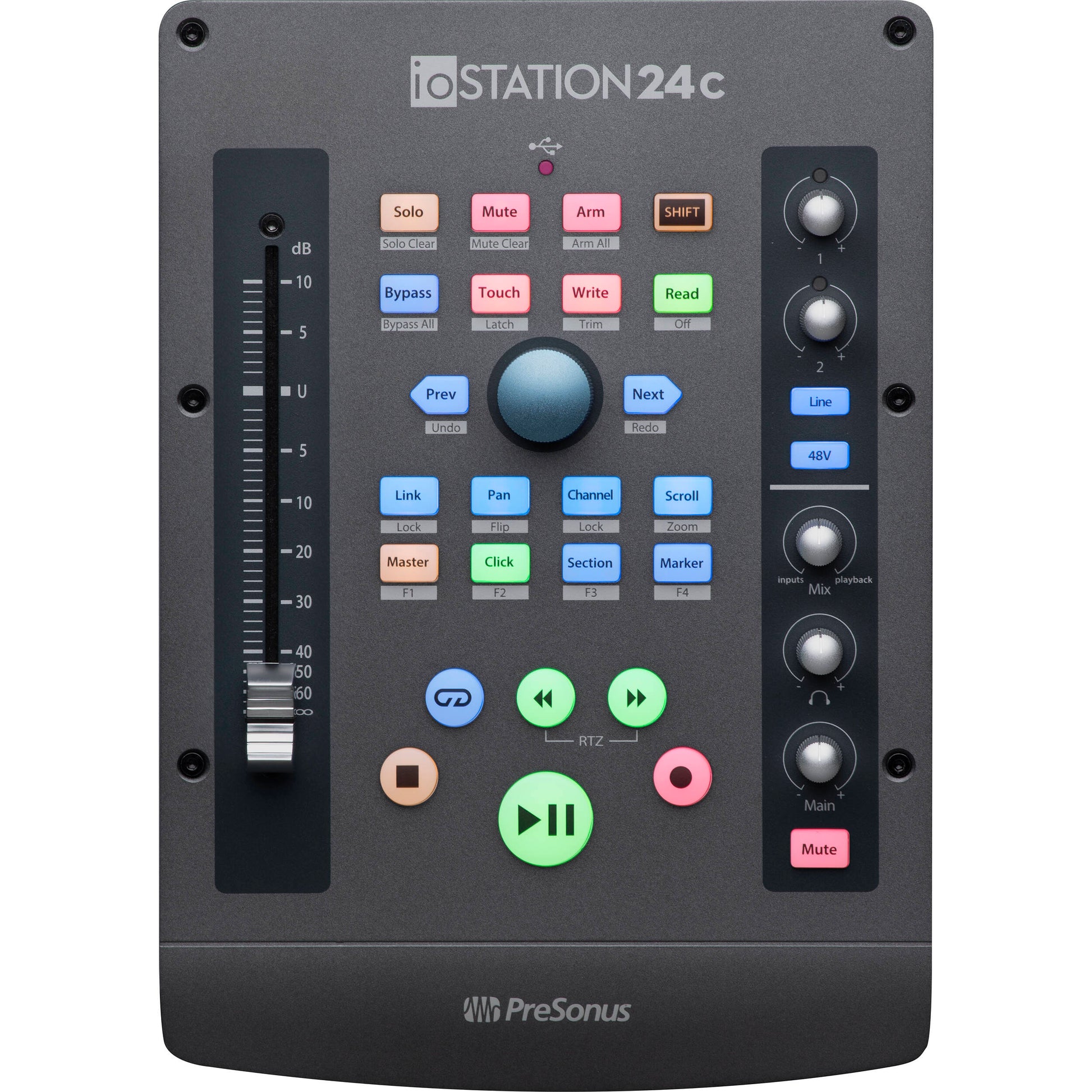 iOStation 24c låner funktioner fra PreSonus' anerkendte FaderPort-serie controllere for at levere en intuitiv arbejdsgang. iOStation 24c formår at indfange oplevelsen af mixning på større skriveborde og kondensere den til et hjemmestudie-interface. Understøttelse af Mackie Control og HUI-protokoller gør det nemt at styre Pro Tools, Logic Pro X, Cubase, Ableton Live og mere. Dette hjælpes yderligere ved ikke at kræve driverinstallation, hvilket sikrer, at du kan begynde at mixe umiddelbart efter tilslutning af iOStation 24c. iOStation 24c tilbyder også dyb integration med den medfølgende PreSonus Studio One Artist.